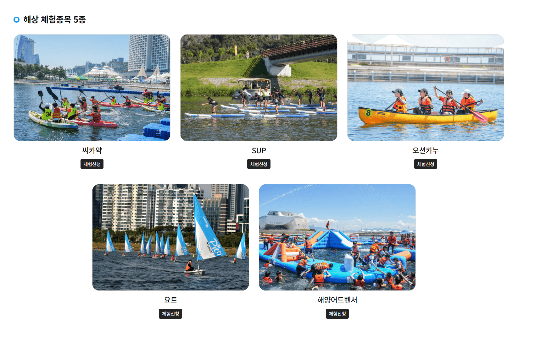 위의 버튼을 클릭하면 씨카약, SUP 패들보, 오션카누, 요트, 해양어드벤처를 신청할 수 있습니다.
