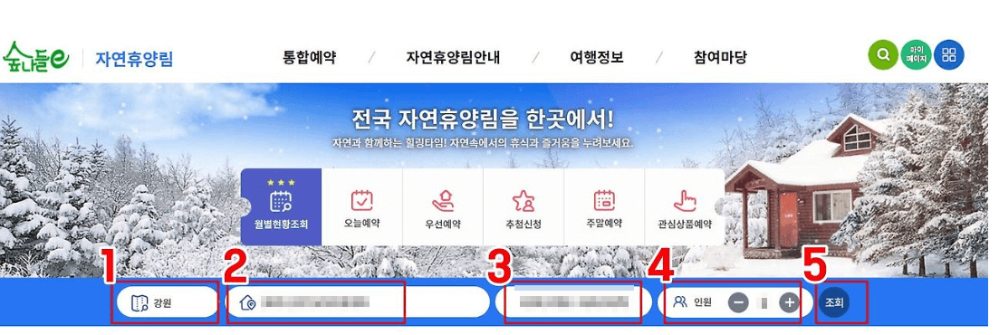 ✅ 월별현황조회에서 지역, 지역, 원하는 휴양림, 날짜, 인원을 기입 후 조회합니다.