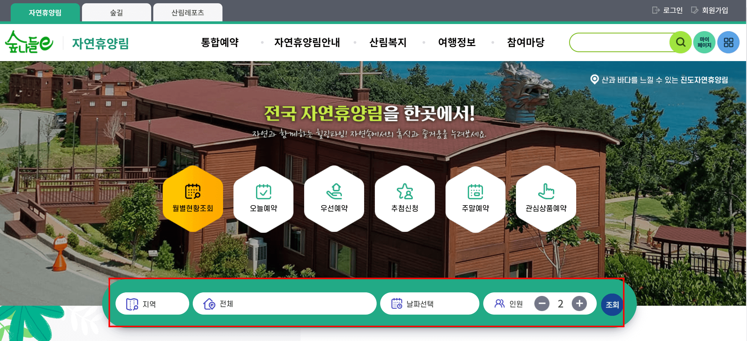 자연휴양림 예약은 숲나들e 홈페이지에서만 신청할 수 있습니다.