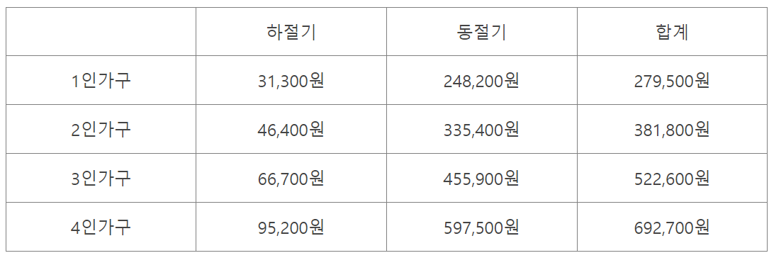 바우처 지원금액은 세대원 수에 따라 다르며, 여름과 겨울로 나누어 지원됩니다.