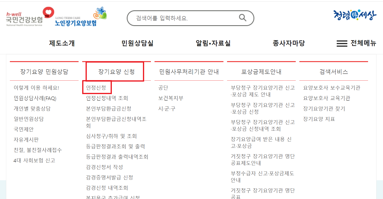 2. 장기요양신청메뉴의 인정신청을 클릭합니다.