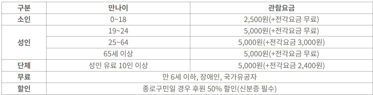 각 나이에 따라 입장 비용이 다르니 아래 표 참고하시기 바랍니다.